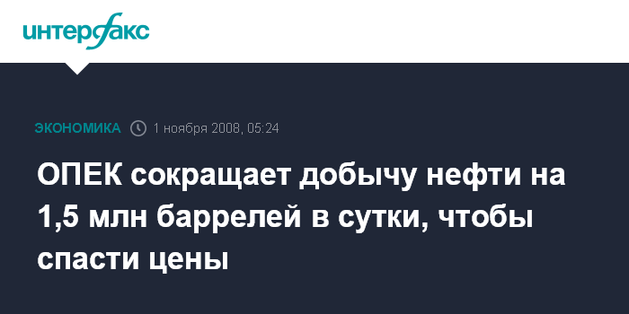 Москва. 1 ноября. ИНТЕРФАКС-АНИ - Организация стран-экспортеров нефти (ОПЕК) с 1 ноября сокращает добычу "черного золота" на 1,5 млн баррелей в сутки или 5% с прежних 28,808 млн б/с, чтобы поддержать цены на нефть, которые после июльских максимумов снизились более чем на половину на опасениях рецессии в мировой экономике.