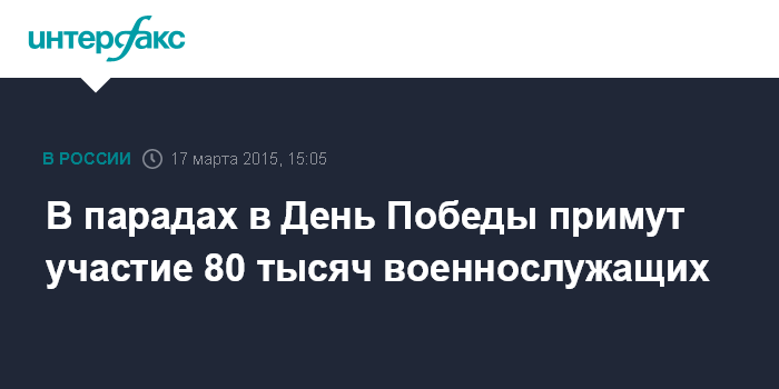 Москва. 17 марта. INTERFAX.RU - Около 80 тысяч военнослужащих и почти 2 тысячи единиц боевой техники примут участие в парадах и торжественных маршах в День Победы, заявил министр обороны России Сергей Шойгу на заседании оргкомитета "Победа" во вторник.