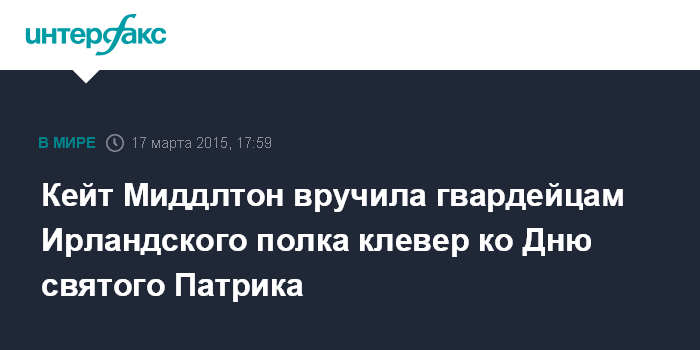 Москва. 17 марта. INTERFAX.RU - Герцогиня Кембриджская Кейт Миддлтон во вторник поздравила гвардейцев первого батальона Ирландского полка с Днем святого Патрика, вручив им букеты клевера, пишет британская газета The Daily Telegraph.