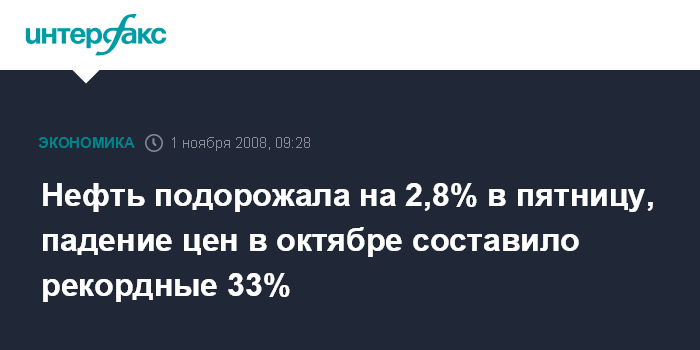 Москва. 1 ноября. INTERFAX.RU - Нефть подорожала на 2,8% в пятницу, таким образом, падение цен в целом за октябрь достигло рекордных с начала торгов в Нью-Йорке с 1983 года 33%, сообщило агентство Bloomberg.