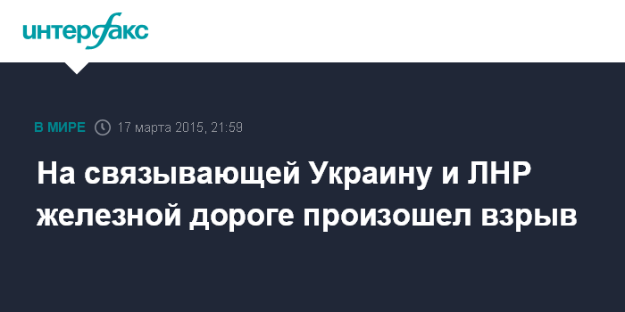 Москва. 17 марта. INTERFAX.RU - Железнодорожное сообщение между самопровозглашенной Луганской народной республикой и Украиной прервано из-за подрыва железнодорожного полотна на контролируемой Украиной территории.
