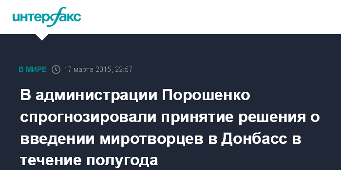 Москва. 17 марта. INTERFAX.RU - В администрации президента Украины прогнозируют, что процесс принятия решения в ООН относительно направления миротворцев на юго-восток Украины может занять около 6 месяцев.