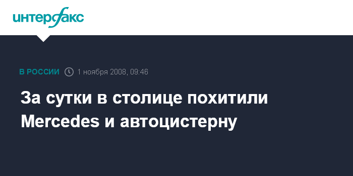 Москва. 1 ноября. INTERFAX.RU - За прошедшие сутки в Москве были похищены Mercedes и автоцистерна, общий материальный ущерб составил около 5 млн рублей, сообщил "Интерфаксу" источник в правоохранительных органах города в субботу.