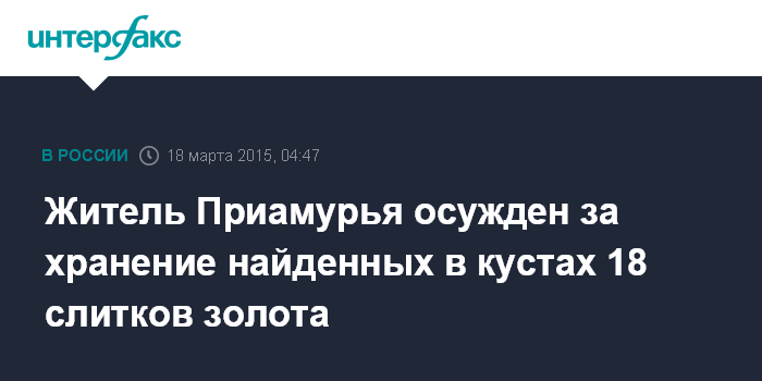 Москва. 18 марта. INTERFAX.RU - Житель Зеи Амурской области осужден за незаконное хранение 18 золотых слитков, которые обнаружил на обочине дороги, сообщает в среду региональная прокуратура.