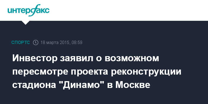 Москва. 18 марта. INTERFAX.RU - Инвестор из-за кризиса может пересмотреть проект реконструкции стадиона "Динамо" и сроки его открытия, сообщил в среду "Интерфаксу" заместитель мэра Москвы по вопросам градостроительной политики и строительства Марат Хуснуллин.