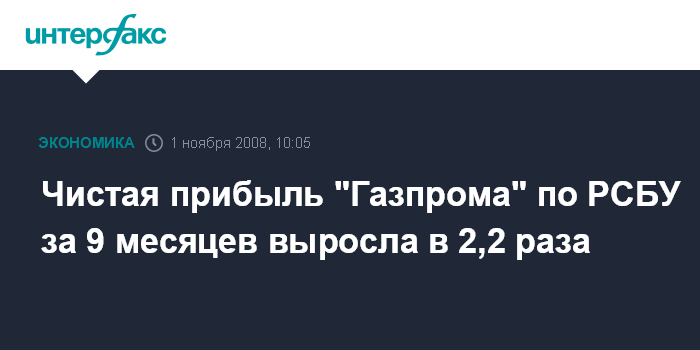 Москва. 1 ноября. INTERFAX.RU - Неконсолидированная чистая прибыль "Газпрома" по российским стандартам бухгалтерского учета (РСБУ) за 9 месяцев 2008 г. увеличилась по сравнению с аналогичным периодом 2007 г. на 123% (в 2,2 раза) - до 432,892 млрд рублей.