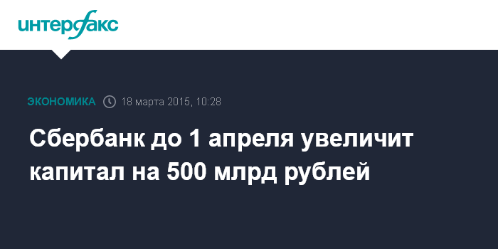 Москва. 18 марта. INTERFAX.RU – Сбербанк до 1 апреля в совокупности планирует увеличить капитал на 500 млрд рублей за счет учета в капитале субординированного кредита от ЦБ РФ на 200 млрд рублей, привлеченного в июне 2014 года, сообщили "Интерфаксу" в пресс-службе Сбербанка.