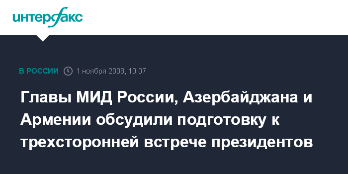 Москва. 1 ноября. INTERFAX.RU - Подготовку к трехстороннему саммиту России, Азербайджана и Армении обсудили в Москве главы МИД трех стран Сергей Лавров, Эльмар Мамедъяров и Эдвард Налбандян.