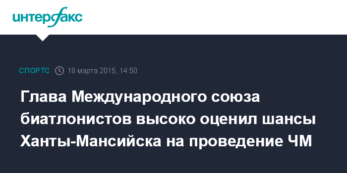 Москва. 18 марта. INTERFAX.RU - Президент Международного союза биатлонистов Андрес Бессеберг заявил, что у Ханты-Мансийска высокие шансы принять у себя чемпионат мира в 2020 году.