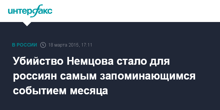 Москва. 18 марта. INTERFAX.RU - Россияне поставили убийство политика Бориса Немцова (53%) на первое место в рейтинге наиболее запомнившихся событий месяца, сообщили "Интерфаксу" в "Левада-Центре". Таким образом, впервые за долгое время верхняя строчка отдана не украинским событиям и не валютным колебаниям.