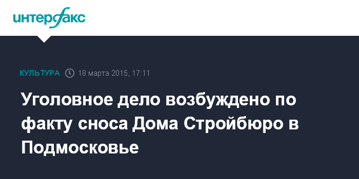 Москва. 18 марта. INTERFAX.RU - Уголовное дело возбуждено по факту сноса в подмосковном Королеве объекта культурного наследия - Дома Стройбюро, сообщается в среду на сайте Генпрокуратуры РФ.