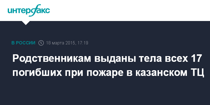 Москва. 18 марта. INTERFAX.RU - Родственникам выданы все 17 тел погибших при пожаре в ТЦ "Адмирал" в Казани 11 марта, сообщила "Интерфаксу" пресс-секретарь Минздрава Татарстана Айгуль Салимзянова в среду.
