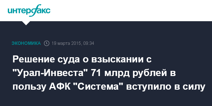 Решение суда о взыскании с "Урал-Инвеста" 71 млрд рублей в пользу АФК "Система" вступило в силу