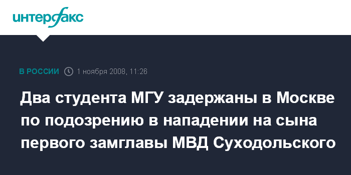 Москва. 1 ноября. INTERFAX.RU - В Москве задержаны студенты юридического факультета МГУ им. Ломоносова, которые причастны к нападению на сына первого заместителя министра внутренних дел России, генерал-лейтенанта милиции Михаила Суходольского.