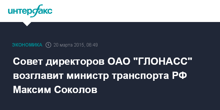 "Председателем совета директоров ОАО "ГЛОНАСС" предложено избрать Максима Соколова [министр транспорта РФ - ИФ], гендиректором назначить Вадима Семенова [председатель совета директоров "Ростелекома" - ИФ]", - рассказал изданию собеседник в Минтранспорта