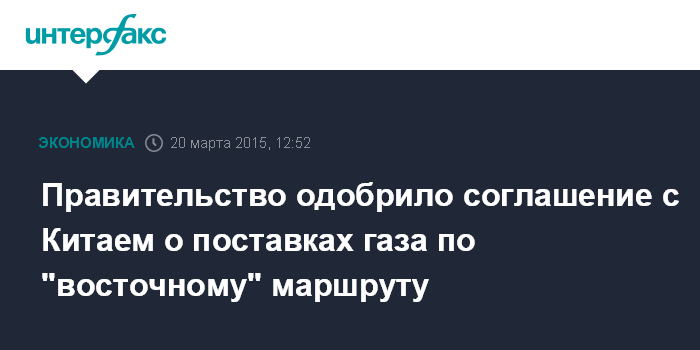 Москва. 20 марта. INTERFAX.RU – Правительство России на заседании 19 марта одобрило законопроект о ратификации соглашения с Китаем о поставках российского газа по "восточному" маршруту, говорится в сообщении, размещенном на сайте правительства.