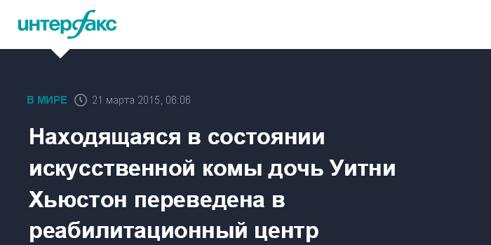 Москва. 21 марта. INTERFAX.RU - Дочь певицы Уитни Хьюстон 21-летняя Бобби Кристина Браун, находящаяся в состоянии искусственной комы, перевели из больницы в реабилитационный центр, сообщает CNN.