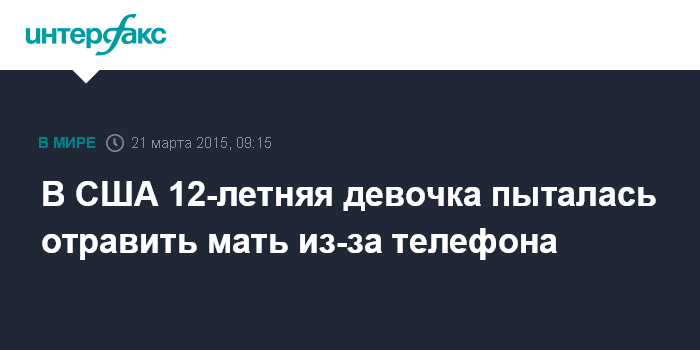 Москва. 21 марта. INTERFAX.RU - Полиция американского штата Колорадо задержала 12-летнюю девочку по подозрению в попытке убийства матери.