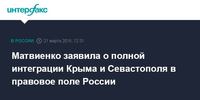 Москва. 21 марта. INTERFAX.RU - Задача интеграции Крыма и Севастополя в правовое поле России за год решена, теперь на передний план выходит экономическое развитие новых российских регионов, заявила председатель Совета Федерации Валентина Матвиенко.