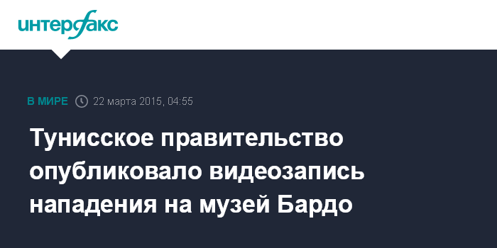 Москва. 22 марта. INTERFAX.RU - Правительство Туниса опубликовало видеозапись нападения террористов на музей Бардо, унесшее жизни 25 человек, сообщила в воскресенье BBC News.