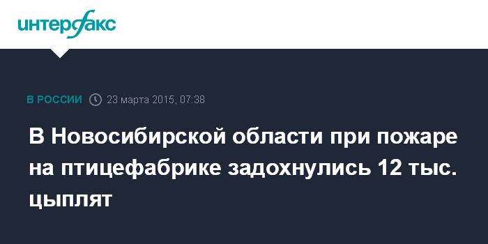 Москва. 23 марта. INTERFAX.RU - Около 12 тысяч десятидневных цыплят задохнулись в результате пожара в птичнике ОАО "Евсинская птицефабрика" в Новосибирской области. Об этом "Интерфаксу" сообщил источник в правоохранительных органах региона.