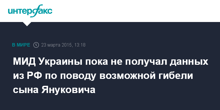 Москва. 23 марта. INTERFAX.RU - Украинская сторона пока не получила ответа из России на запрос относительно информации о якобы гибели сына экс-президента Украины Виктора Януковича-младшего, сообщил официальный представитель министерства иностранных дел Украины Евгений Перебийнис.