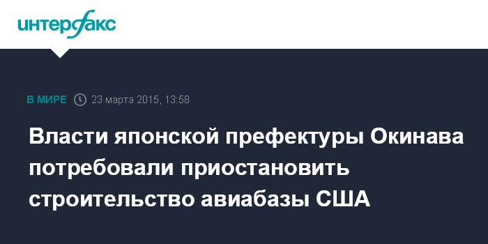 Москва. 23 марта. INTERFAX.RU - Губернатор японской префектуры Окинава Такэси Онага заявил, что направил в Минобороны требование прекратить все работы на территории, где вскоре должна появиться военная авиабаза США.