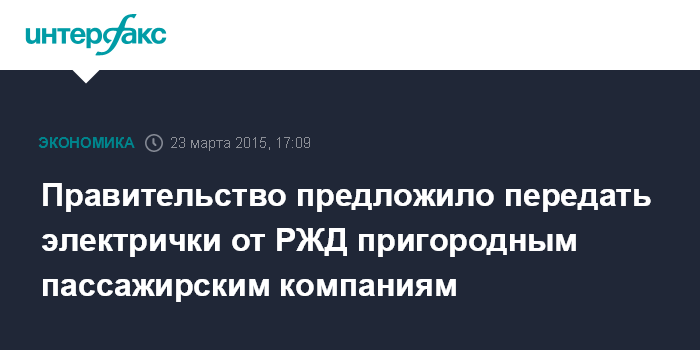 Москва. 23 марта. INTERFAX.RU – Правительство России предлагает передать электрички, находящиеся в собственности РЖД, пригородным пассажирским компаниям, говорится в предложениях кабинета министров по повышению эффективности целевой модели организации пригородного железнодорожного сообщения.