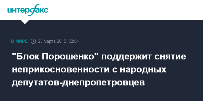 Москва. 23 марта. INTERFAX.RU - На заседании совета фракции партии "Блок Петра Порошенко" в понедельник принято решение удовлетворить заявления депутатов Андрея Денисенко, Виталия Куприя, Валентина Дидыча и Александра Дубинина о выходе из фракции, а также обратиться в Генпрокуратуру Украины расследовать ряд преступлений, в которых фигурируют имена парламентариев.