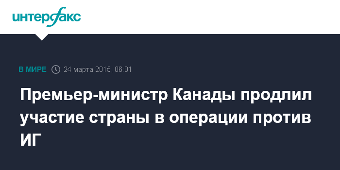 Москва. 24 марта. INTERFAX.RU - Премьер-министр Канады Стивен Харпер намерен во вторник выступить в парламенте и объявить о решении продлить канадское участие в операции против группировки "Исламское государство" (ИГ) сроком на год, сообщает агентство АP со ссылкой на официальный источник.
