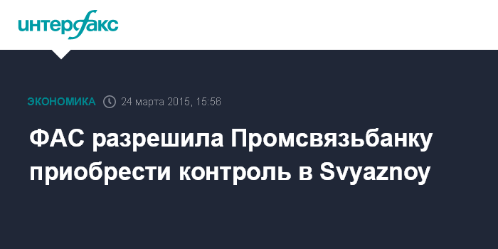 Москва. 24 марта. INTERFAX.RU – Федеральная антимонопольная служба удовлетворила ходатайство Промсвязьбанка о приобретении 51% нидерландской компании Svyaznoy N.V., владеющей активами розничной сети "Связной".