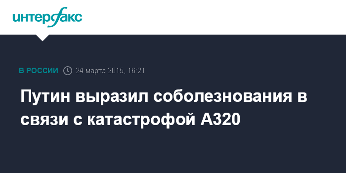 Москва. 24 марта. INTERFAX.RU - Президент РФ Владимир Путин выразил соболезнования Федеральному канцлеру ФРГ Ангеле Меркель в связи с гибелью пассажиров и членов экипажа самолета германской авиакомпании, разбившегося на юге Франции, сообщает пресс-служба Кремля. Глава Российского государства передал слова сочувствия и поддержки родным и близким погибших, отмечается в сообщении.