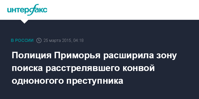 Москва. 25 марта. INTERFAX.RU - Расширена зона поиска одноногого преступника, расстрелявшего во вторник во Владивостоке полицейский конвой и сбежавшего с табельным оружием.