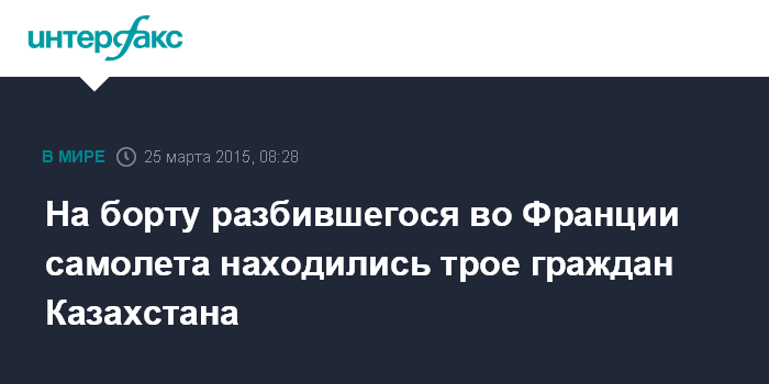 Москва. 25 марта. INTERFAX.RU - Министерство иностранных дел Казахстана подтверждает факт гибели трех граждан республики, находившихся на борту самолета авиакомпании Germanwings, потерпевшего крушение на юге Франции 24 марта.