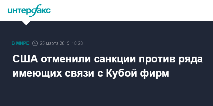 Москва. 25 марта. INTERFAX.RU - Власти США отменили ограничительные меры против почти 50 судоходных компаний, торговых фирм и частных лиц, которые были внесены в санкционный список за связи с Кубой, сообщают в среду американские СМИ.