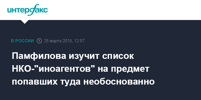 Москва. 25 марта. INTERFAX.RU - Уполномоченный по правам человека в РФ Элла Памфилова проведет ревизию списка НКО - иностранных агентов, утвержденного Минюстом РФ.