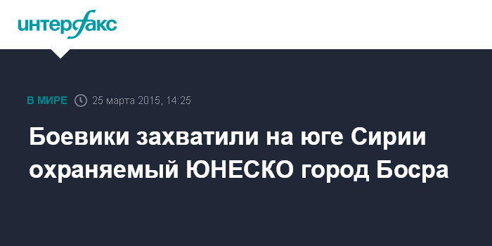 Москва. 25 марта. INTERFAX.RU - Боевики антиправительственных сил взяли под контроль на юге Сирии город Босра, расположенный вблизи границы с Иорданией, сообщает в среду Наблюдательный совет по правам человека в Сирии.