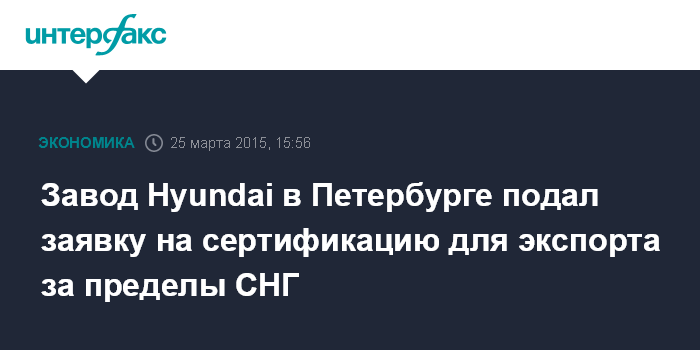 Москва. 25 марта. INTERFAX.RU – Завод Hyundai в Петербурге подал заявку на получение сертификата происхождения продукции, который позволяет экспортировать автомобили за пределы СНГ, сообщил журналистам председатель городского комитета по промышленной политике и инновациям Максим Мейксин в рамках деловой программы выставки "Автопром Россия" в Петербурге в среду.