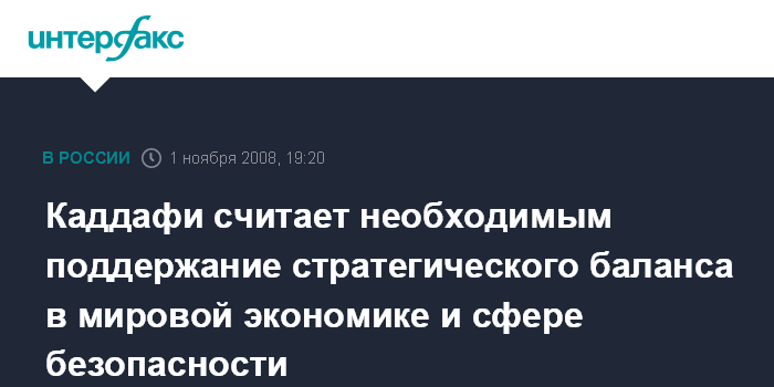 "Мы считаем очень важной нашу общую задачу по укреплению и восстановлению механизма сохранения международного мира и безопасности. Этого невозможно добиться без обеспечения стратегического баланса. Это относится как к экономической сфере, так и к сфере безопасности", - заявил Каддафи на встрече с премьер-министром России Владимиром Путиным в Москве в субботу.