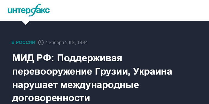 Москва. 1 ноября. INTERFAX.RU - Вооружая Грузию и не желая признавать необходимость предотвращения ремилитаризации этой страны, Украина нарушает международные обязательства, заявляют в МИД РФ.