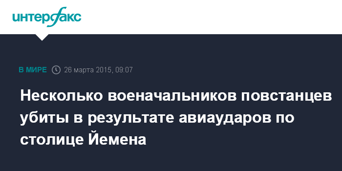 Москва. 26 марта. INTERFAX.RU - В результате авиаударов ВВС Саудовской Аравии и Объединенных Арабских Эмиратов по йеменской столице Сане в четверг погибли несколько представителей военного руководства повстанцев-хуситов, сообщил телеканал Al Arabiya.