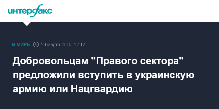 Москва. 26 марта. INTERFAX.RU - Представителям добровольческого украинского корпуса "Правый сектор" (радикальная организация запрещена в РФ) было предложено вступить в ряды украинской армии, однако батальон решения еще не принял, сообщил агентству "Интерфакс" и.о. спикера Генштаба Вооруженных сил Украины Владислав Селезнев.