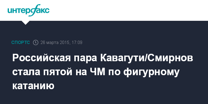 Москва. 26 марта. INTERFAX.RU - Российская пара фигуристов Юко Кавагути/Александр Смирнов заняла пятое место в соревновании спортивных пар на проходящем в Шанхае чемпионате мира.