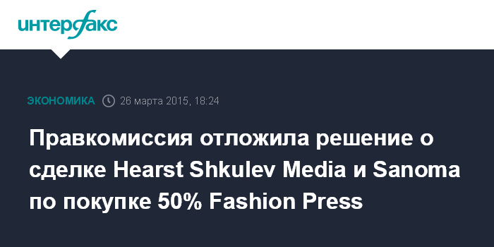 Москва. 26 марта. INTERFAX.RU - Правкомиссия по иностранным инвестициям отложила рассмотрение сделки Hearst Shkulev Media по покупке 50% Fashion Press (издает в России журналы Cosmopolitan и Esquire) у совладельца издательства, финской Sanoma, сообщил глава Федеральной антимонопольной службы (ФАС) Игорь Артемьев.