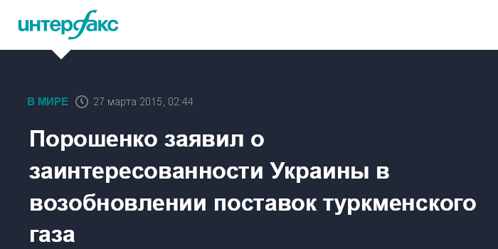 Москва. 27 марта. INTERFAX.RU - В ходе встречи Петра Порошенко с заместителем главы правительства Туркменистана Рашидом Мередовым украинский президент подчеркнул заинтересованность Украины в диверсификации поставок газа, в том числе за счет туркменского природного ресурса, сообщает пресс-служба президента Украины.
