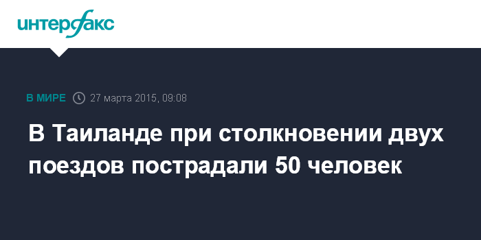 Москва. 27 марта. INTERFAX.RU - 50 человек получили ранения в результате столкновения двух поездов в центральной части Таиланда, сообщает в пятницу агентство EFE.