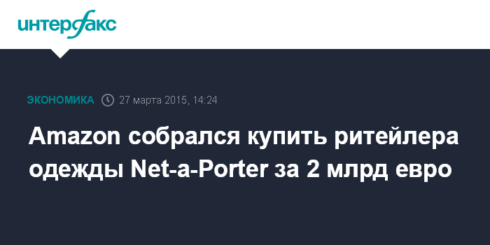 Москва. 27 марта. INTERFAX.RU – Крупнейший в мире интернет-аукцион Amazon.com ведет переговоры приобретении онлайн-магазина дорогой одежды Net-a-Porter за 2 млрд евро, сообщает Forbes со ссылкой на информированный источник.