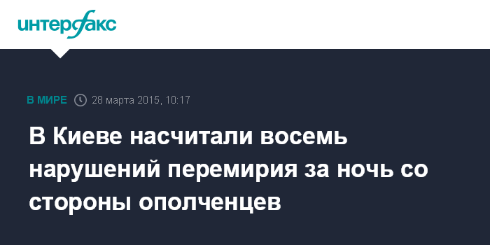 Москва. 28 марта. INTERFAX.RU - Восемь нарушений режима тишины со стороны ополченцев зафиксированы в ночь на субботу, сообщает пресс-центр силовой операции на востоке Украины.