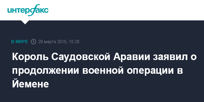 Москва. 28 марта. INTERFAX.RU - Военная интервенция арабских стран в Йемен будет продолжаться до тех пор, пока ситуация в этой стране не стабилизируется, сообщило в субботу агентство EFE со ссылкой на короля Саудовской Аравии Салмана ибн Абдель Азиза Аль Сауда.