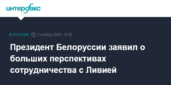 Минск. 2 ноября. INTERFAX.RU - Президент Белоруссии Александр Лукашенко заявил о наличии новых возможностей развития сотрудничества с Ливией по самым разным направлениям.